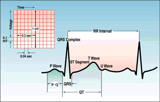Elektrokardiogramm (EKG) - südame film - on elektriliste potentsiaalide muutuse registreerimine keha pinnalt, mis on seotud erutuslaine tekke, kulgemise ja vaibumisega südamelihases ja mis ulatuvad keha välispinnani ( südame aktsioonipotentsiaalide registreerimine). Kui registreerida potentsiaalide erinevust paremale käele ja vasakule jalale asetatud elektroodid vahel, on EKG kuju selline nagu näha kõrvaloleval joonisel.EKG koosneb sakkidest, mis on tähistatud tähtedega P,Q,R,S,T. Võib esineda ka U sakk, mida seostatakse erutuse vaibumisega erutusjuhtesüsteemi lõpposas. P sakk tähistab erutuse levikut kodades, Q,R,S,T sakid erutuse levikut vatsakestes. P,R,T on positiivsed ja Q, S negatiivsed sakid. Kahe saki vahemaad nimetatakse segmendiks (P saki lõpust Q saki alguseni), sakki koos sellele järgneva segmendiga intervalliks (P saki algusest Q saki alguseni).