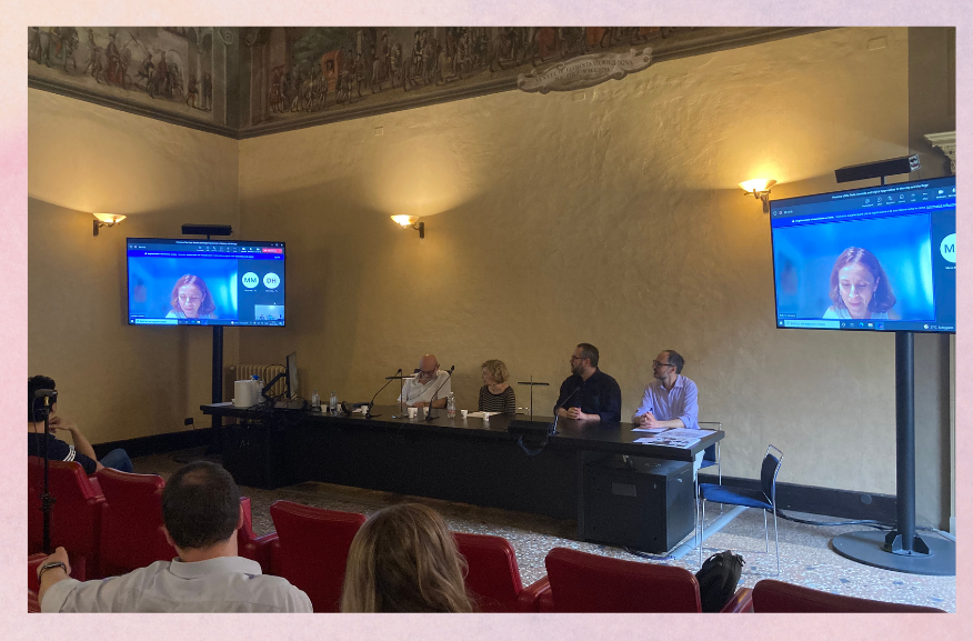Fotol: TÜHI ja Bologna ülikooli koostööleppe avalik kinnitamine 9. juunil Bologna ülikooli Umberto Eco-nimelise humanitaarteaduste keskuses. Vasakult Bologna ülikooli rahvusvaheliste suhete prorektor Raffaella Campaner (ekraanil), Umberto Eco-nimelise humanitaarteaduste keskuse direktor prof. Constantino Marmo, keskuse endine direktor, emeriitprofessor Patrizia Violi, TÜHI professorid Marek Tamm ja Daniele Monticelli.