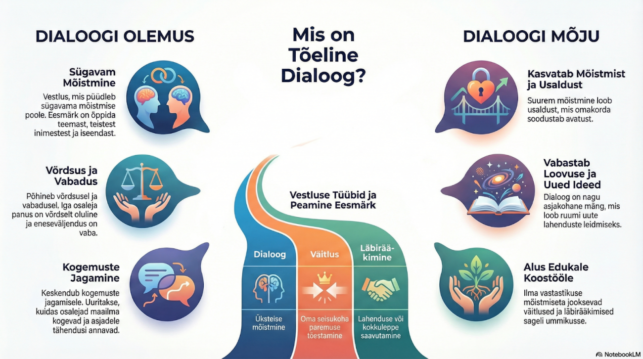 "Dialoogi all peetakse silmas vestlust, mille eesmärk on saavutada parem arusaamine käsitletavatest teemadest, teistest inimestest ja iseendast."